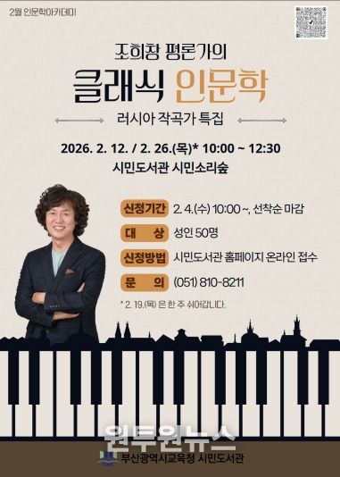 이은경 시민도서관장은 “이번 특강은 어렵게 느껴질 수 있는 클래식 음악을 보다 쉽고 친근하게 접할 수 있는 기회가 될 것”이라며, “러시아 음악가들의 삶과 예술을 통해 깊은 위로와 통찰을 얻는 시간이 되길 바란다”고 말했다.