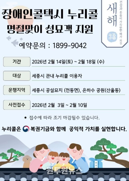 (원투원뉴스) 세종도시교통공사는 민족의 대명절 설을 맞아 2월 14일부터 18일까지 5일간 교통약자 성묘객을 대상으로 ‘성묘 이동지원 서비스’를 제공한다고 밝혔다.