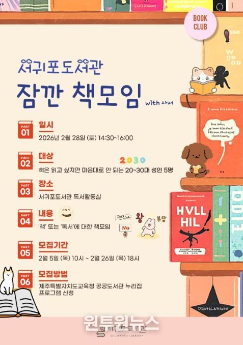 (원투원뉴스) 제주도교육청 서귀포도서관은 2월부터 10월까지 지역 주민의 자발적인 독서 습관 형성을 돕고, 도서관을 열린 문화 공간으로 활성화하기 위해 사서와 함께하는 ‘잠깐 책모임’을 운영한다.