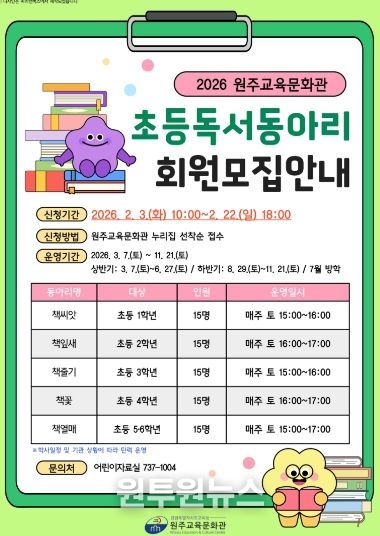 (원투원뉴스) 원주교육문화관(관장 용석태)은 2월 3일부터 선정 도서를 깊이 읽는 활동을 통해 문해력을 강화하고 지역사회 독서 공동체를 활성화하기 위해 초등학생과 중학생을 대상으로 ‘2026년 독서동아리 회원 모집’을 실시한다.