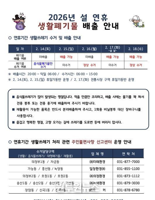 (원투원뉴스) 의정부시는 설 연휴 기간 시민들이 쾌적한 환경에서 명절을 보낼 수 있도록 생활쓰레기 관리대책을 수립하고 청소대책 상황실을 운영한다.
