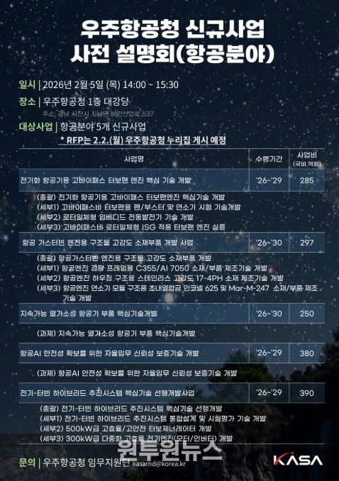 (원투원뉴스) 우주항공청은 2월 5일 오후 2시, 사천 우주항공청 1층 대강당에서 2026년 항공분야 신규사업의 주요 내용을 공유하고, 산·학·연 연구자의 적극적인 참여와 심도 있는 이해를 돕기 위한 사전설명회를 개최한다고 밝혔다.