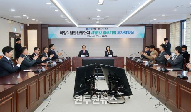 (원투원뉴스) 안성시는 2026년 2월 3일 시청 본관 2층 상황실에서 동우일렉트릭 주식회사와 ‘미양3 일반산업단지 시행 및 입주기업 투자유치 양해각서(MOU)’를 체결했다. 이번 협약을 통해 동우일렉트릭(주)는 미양3 일반산업단지에 총 1,303억 원을 투자하고 500명의 신규 고용을 창출하기로 했다.