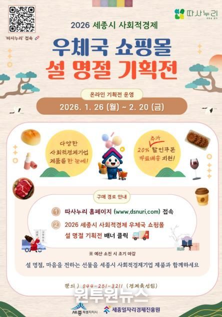 (원투원뉴스) 세종일자리경제진흥원이 설 명절을 맞아 세종시 사회적경제기업의 온라인 판로 확대와 매출 증대를 위해 ‘2026년 세종시 사회적경제 우체국쇼핑몰 온라인 설 기획전’을 운영한다고 밝혔다.