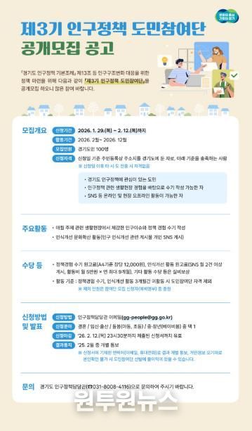 (원투원뉴스) 경기도가 정책 대상자가 직접 정책개선에 참여하는 ‘제3기 인구정책 도민참여단’ 100명을 공개 모집한다.