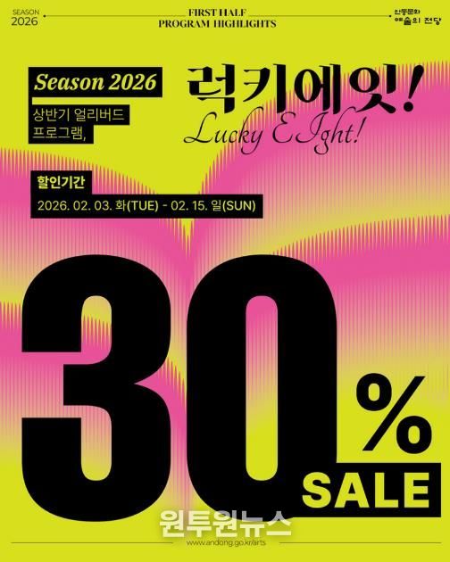 (원투원뉴스) 안동문화예술의전당은 상반기 주요 공연을 대상으로 30% 할인 혜택을 제공하는 특별 프로모션 ‘럭키에잇!’을 진행한다고 밝혔다.