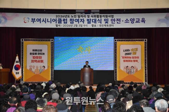 (원투원뉴스) 부여시니어클럽은 지난 3일 부여국민체육센터에서 노인일자리 및 사회활동 지원사업 참여 어르신 약 2,040명을 모시고, 2026년 노인일자리 발대식 및 안전교육을 실시했다.