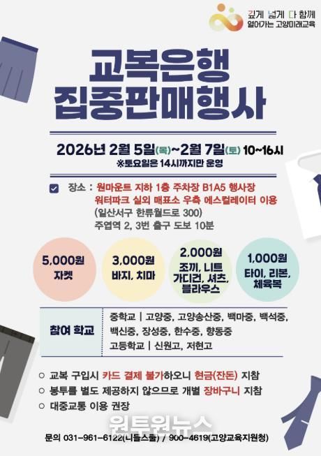 (원투원뉴스) 경기도고양교육지원청은 관내 중·고등학교 졸업생의 교복 물려주기 일환으로 교복은행 집중판매 행사를 2월 5일부터 7일까지 3일간 고양 원마운트에서 진행한다고 밝혔다.
