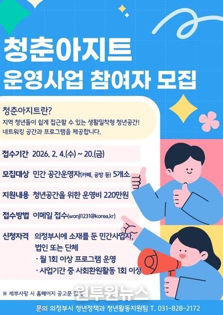 (원투원뉴스) 의정부시는 청년들이 일상 속에서 자유롭게 모이고 활동할 수 있도록 생활밀착형 청년공간 ‘청춘아지트’ 사업에 참여할 민간사업자를 모집한다.
