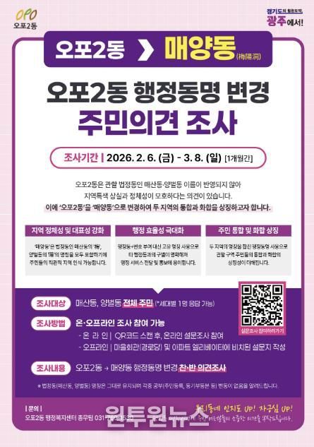 (원투원뉴스) 광주시 오포2동은 지역 정체성을 반영한 행정동 명칭 변경을 위해 2월 6일부터 3월 8일까지 오포2동 전 세대를 대상으로 주민 의견 조사를 실시한다고 4일 밝혔다.