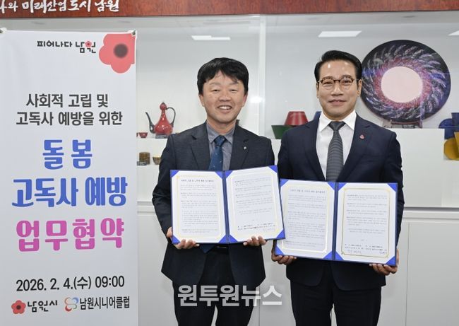 (원투원뉴스) 남원시는 사회적 고립 및 고독사 예방을 위한 지역 돌봄 체계 강화를 위해 2월 4일 시장실에서 남원시니어클럽(관장 김현성)과 업무협약을 체결했다.