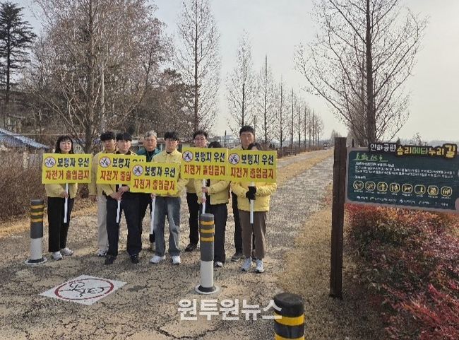 무장애나눔길은 노약자와 장애인, 임산부 등 보행약자가 불편 없이 이용할 수 있도록 조성된 보행 전용 산책로로, 자전거와 개인형 이동장치(PM)가 통행할 경우 충돌 사고 위험이 크다.