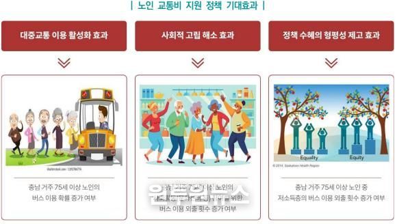 또한 충남의 정책 수혜 대상 노인은 비수혜 연령층(65∼74세)에 비해 외출 시 버스를 이용할 가능성이 약 1.6배 높게 나타났다.
