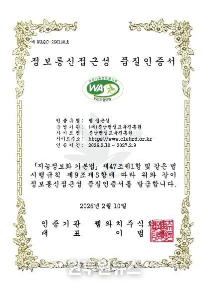 (원투원뉴스) 충남평생교육진흥원은 과학기술정보통신부 지정 국가공인 인증기관(㈜웹와치)으로부터 정보통신접근성 품질인증을 획득했다고 밝혔다.