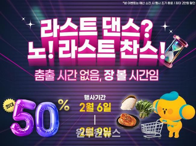 이번 기획전은 명절 직전까지 바쁜 일상으로 장보기에 여유가 없었던 소비자를 겨냥해 “라스트 댄스? 노! 라스트 찬스!_춤출 시간없음, 장 볼 시간임”이라는 유쾌한 콘셉트로 기획됐으며, 설 상차림에 필요한 고흥산 농수축특산물을 최대 50% 할인된 가격으로 선보인다.
