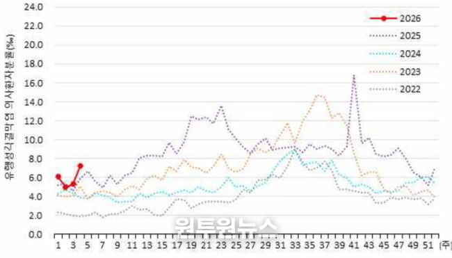 질병관리청 표본감시 자료에 따르면, 1월 넷째 주 유행성결막염 의사환자 분율은 인구 1,000명당 7.2명으로 집계됐다. 이는 전주(5.3명)보다 증가한 수치로, 2022년부터 2025년까지 최근 4년간 같은 기간과 비교해도 가장 높은 수준이다.