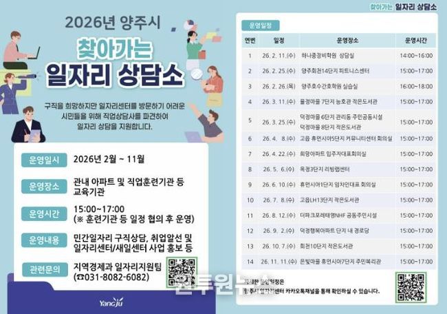 (원투원뉴스) 양주시가 구직 현장의 문턱을 낮추고 시민들의 취업 성공률을 높이기 위해 오는 11월까지 ‘2026년 찾아가는 일자리 상담소' 를 운영한다.