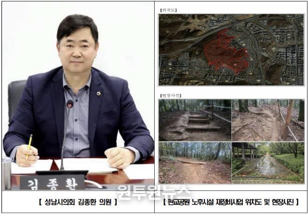 (원투원뉴스) 성남시의회 국민의힘 김종환 의원(판교·백현·운중·대장동, 예산결산특별위원장)은 분당구 판교동 판교공원 일원 노후 산책로와 바닥포장 등을 정비하는 재정비공사가 본격 추진됨을 밝혔다.