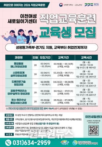 (원투원뉴스) 이천여성새로일하기센터는 경력 단절 여성의 직업능력 개발과 취·창업 연계를 위해 2026년 직업교육훈련 교육생을 모집한다.