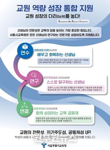 ‘교원 성장의 다리(Da:RI, Development and Research Integration)’는 연수(배우고 회복하는 선생님), 연구(스스로 탐구하는 선생님), 연결(함께 성장하는 교육공동체)의 통합 지원 체계 구축을 상징하며, 서울교육의 현재와 미래를 연결하는 다리(Bridge)를 의미한다. 구체적인 내용은 다음과 같다.
