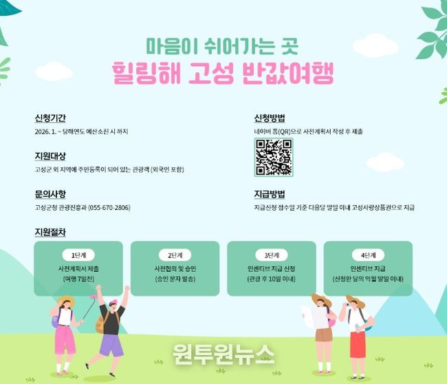 (원투원뉴스) 고성군은 관광객 유치증대 및 체류형 관광 활성화로 지역경제에 활력을 불어넣기 위해 2026년 신규사업으로 ‘마음이 쉬어가는 곳, 힐링해 고성 반값여행’을 시행한다고 밝혔다.