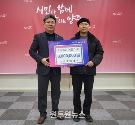 (원투원뉴스) (주)크로바가구는 지난 3일 겨울철을 맞아 지역 내 취약계층과 소외된 이웃을 돕기 위해 성금 300만 원을 회천1동 행정복지센터에 전달했다.