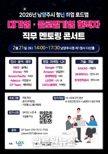 (원투원뉴스) 남양주시는 설 연휴 이후 본격적인 취업 준비에 나서는 청년을 지원하기 위해 ‘2026년 남양주시 청년 취업 로드맵 대기업·글로벌기업 현직자 직무 멘토링 콘서트’ 참여자 약 150명을 모집한다고 4일 밝혔다.