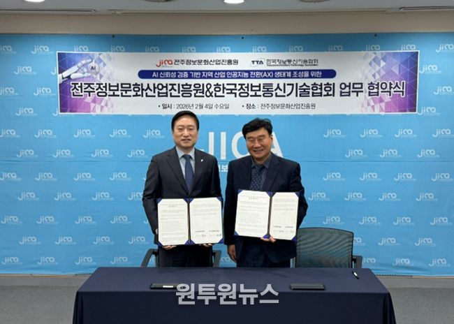 (원투원뉴스) 전주시 출연기관인 전주정보문화산업진흥원은 4일 진흥원 멀티미디어기술지원센터 1층 세미나실에서 한국정보통신기술협회와 AI 신뢰성 검증 기반 지역 산업 인공지능 디지털 전환(AX) 생태계 조성을 위한 업무협약을 체결했다.