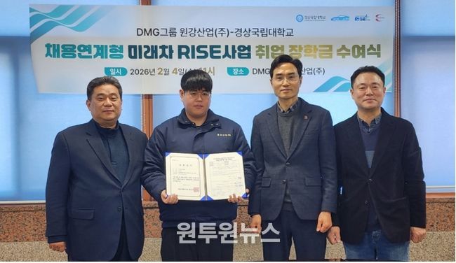 경남도는 4일 함안군 소재 원강산업(주) 회의실에서 경상국립대 학생을 대상으로 한 ‘라이즈 사업 취업 장학금 수여식’을 개최했다고 밝혔다. 이번 장학금은 도내 자동차 부품 제조기업인 원강산업(주)이 지난해 9월 경상국립대에 기탁한 발전기금 1억 원을 재원으로 마련됐다.
