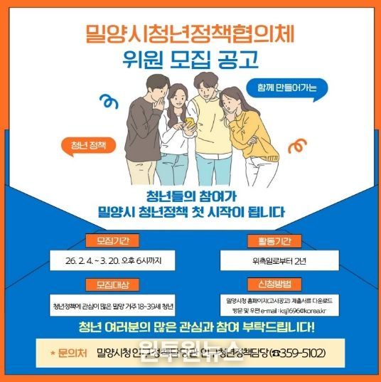 (원투원뉴스) 경남 밀양시는 오는 3월 20일까지 시정의 주역으로서 청년 문제를 논의하고 정책을 직접 발굴·제안할 청년정책협의체 구성원을 모집한다.
