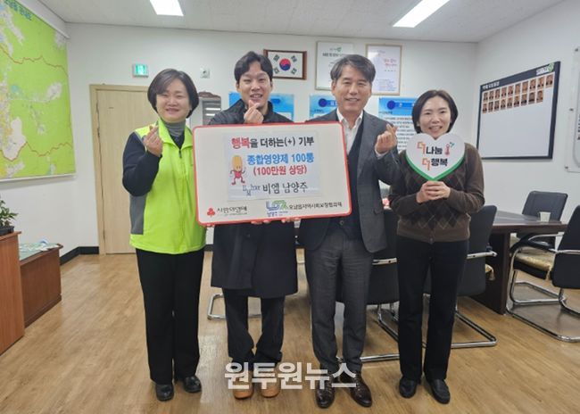 (원투원뉴스) 남양주시는 4일 유통 전문회사 비엠 남양주가 지역 내 취약계층을 위해 마련한 종합영양제 100통을 오남읍 지역사회보장협의체에 전달했다고 밝혔다.