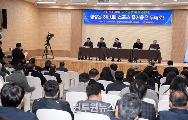 (원투원뉴스) 광주광역시는 4일 올림픽기념국민생활관에서 광주체육 관계자 180여 명이 참석한 가운데 ‘광주전남 통합 체육 분야 시민공청회’를 개최했다.