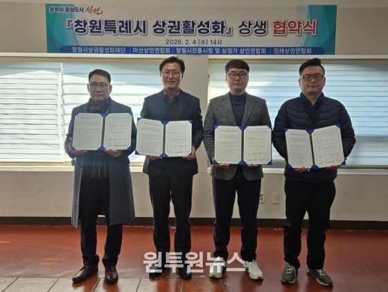 (원투원뉴스) 창원시상권활성화재단(이사장 장금용)은 2월 4일 오후 2시, 창원시상권활성화재단 어울림센터에서 마산통합상인연합회, 창원시 전통시장 및 상점가 상인연합회, 진해상인연합회(대표시장: 진해중앙시장)와 '창원특례시 상권활성화'를 위한 상생 업무협약을 체결했다.