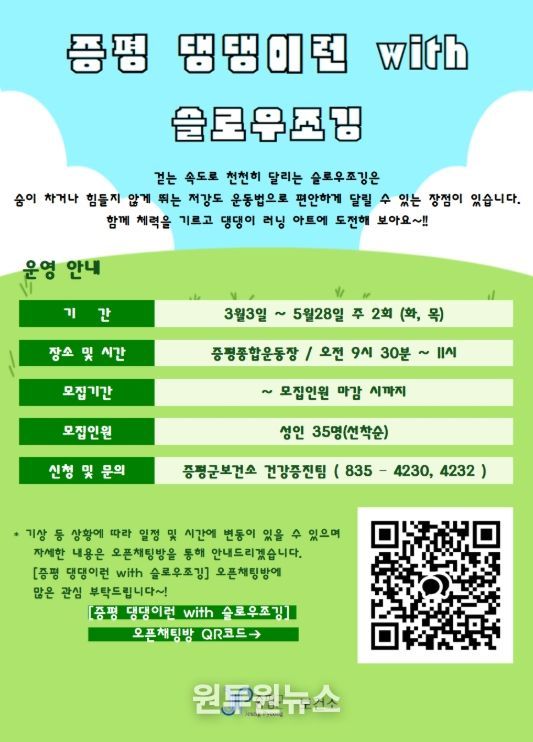 (원투원뉴스) 충북 증평군보건소가 지역주민의 신체활동 증진과 만성질환 예방을 위해 슬로우조깅 프로그램 참여자 35명을 이달 27일까지 선착순 모집한다.