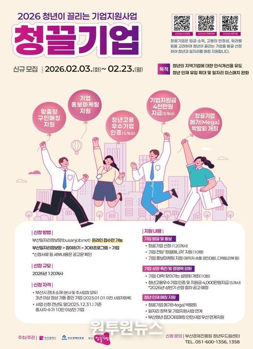 (원투원뉴스) 부산시와 (재)부산경제진흥원은 지역 청년들이 신뢰할 수 있는 기업을 발굴하고 실질적인 채용 성과로 이어질 수 있도록 지원하는 '2026년 청끌(청년이 끌리는)기업 발굴·매칭 지원사업'에 참여할 신규기업 30개 사를 오는 2월 23일까지 모집한다고 밝혔다.