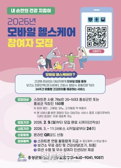 모집인원은 선착순 150명으로, 스마트폰 사용 가능 20~50대 홍성군민 또는 홍성군 직장인으로 선정된다. 참여 희망자는 QR코드 스캔통한 온라인으로 신청가능하며, 자세한 사항은 보건소 건강생활팀으로 문의하면 된다.