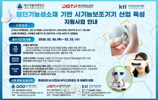 (원투원뉴스) 대구광역시는 산업통상부, 경상북도와 함께 ‘2026년 첨단 기능성 소재 기반 시(視)기능 보조기기 육성사업’을 본격 추진하고, 참여기업을 모집한다.