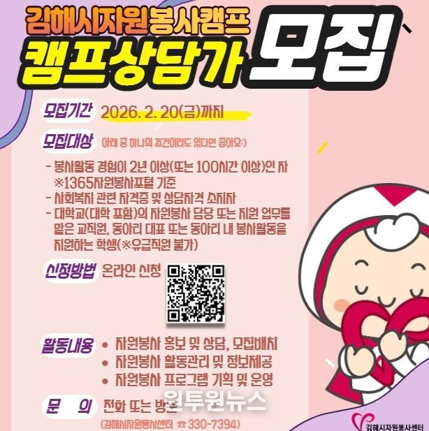 (원투원뉴스) 김해시자원봉사센터는 관내 자원봉사캠프 7개소(행정복지센터 6, 문화의집 1)에서 활동할 열정 가득한 신규 캠프상담가를 모집한다고 5일 밝혔다.