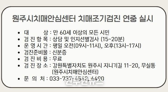 (원투원뉴스) 원주시치매안심센터는 치매 조기 발견과 적기 치료를 위해 지역 내 60세 이상 주민을 대상으로 치매 조기 검진 사업을 연중 실시하고 있다.