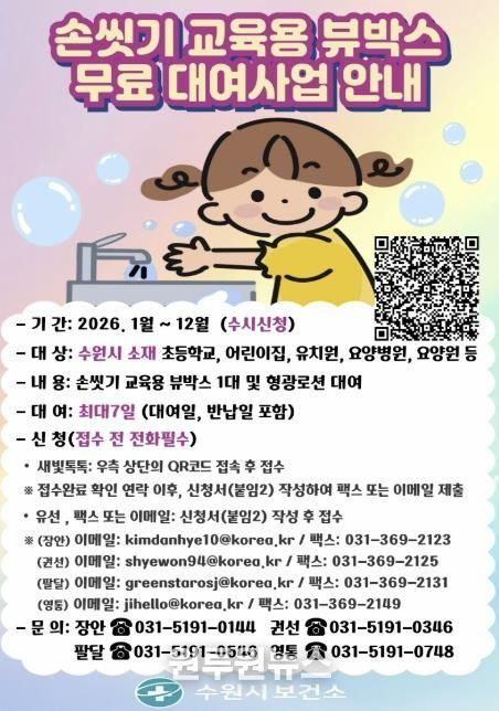 (원투원뉴스) 수원시보건소가 교육용 손씻기 체험 기구인 ‘뷰박스(View-box)’를 무료로 대여한다.