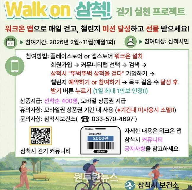 (원투원뉴스) 삼척시는 시민들의 건강 증진과 일상 속 걷기 실천율 향상을 위해 모바일 걷기 앱 '워크온(Walk On)'을 활용한 ‘워크온 걷기 챌린지’를 오는 2월부터 11월까지 운영한다.