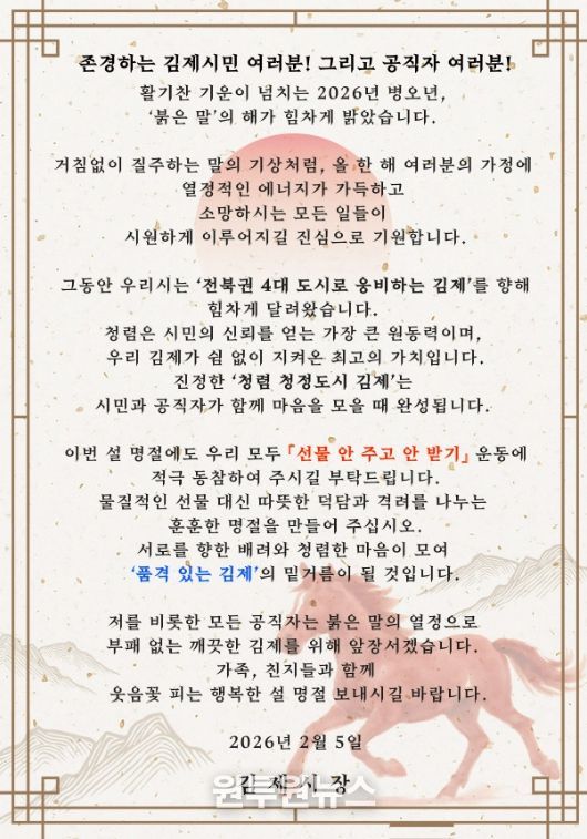 (원투원뉴스) 김제시는 설 명절을 맞아 청렴한 공직 문화를 조성하고 ‘지평선 너머 새만금까지 비상하는 김제’로 나아가기 위해 올해 제1호 ‘청렴주의보’를 발령한다고 밝혔다.