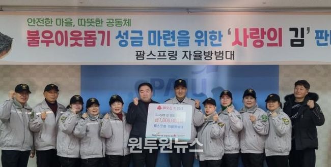 팜스프링 자율방범대는 지난 1월 30일 금촌3동 행정복지센터를 방문해 현금 100만 원을 전달했다. 이번 기탁금은 자율방범대원들이 직접 발로 뛰며 진행한 ‘사랑의 김 판매’수익금으로 마련되어 그 의미를 더했다.
