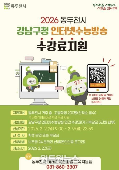(원투원뉴스) 동두천시는 사교육비 부담을 경감하고 교육 격차를 해소하기 위해 관내에 거주하는 중·고등학생을 대상으로 강남구청 인터넷수능방송 연간 수강료 지원 사업을 추진하고 있다.