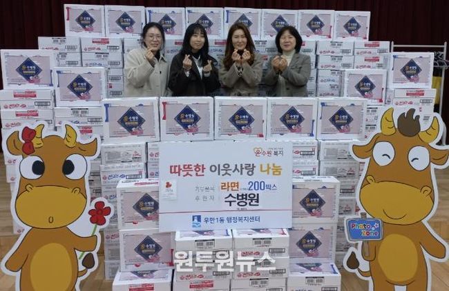 (원투원뉴스) 수병원은 지난 4일, 설 명절을 맞아 어려운 이웃들을 위해 라면 200박스를 우만1동 행정복지센터에 기부하며 이웃사랑을 실천했다.