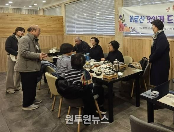 (원투원뉴스) 수원시 팔달구 화서1동은 지난 4일, 2월 생일을 맞이한 독거어르신 7명을 모시고 이교수한정식에서 '어르신 사랑의 생신상' 행사를 진행했다.