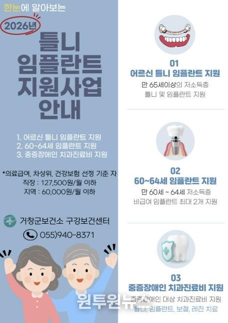 (원투원뉴스) 거창군 보건소는 오는 9일부터 27일까지 치아 상실로 식사와 일상생활에 불편을 겪고 있는 저소득층을 대상으로 틀니, 임플란트 지원사업 신청을 받는다.