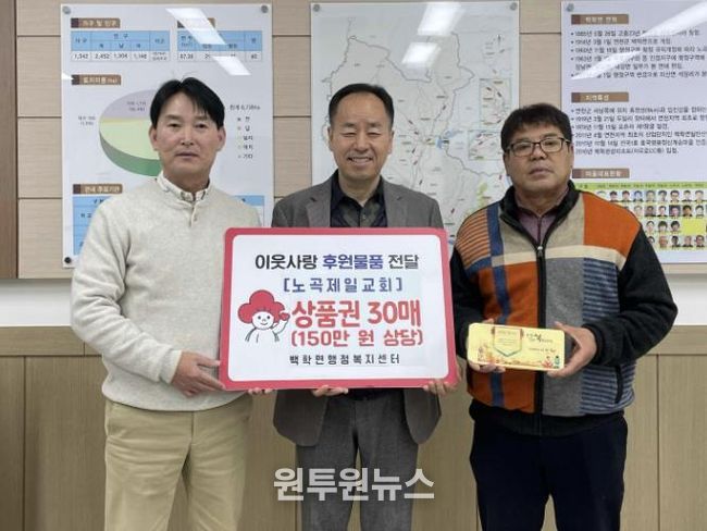 (원투원뉴스) 연천군 백학면 노곡제일교회는 지난 4일 백학면행정복지센터를 방문해 설 명절을 맞아 소외계층에게 전달해달라며 농촌사랑상품권 150만 원을 기탁했다.