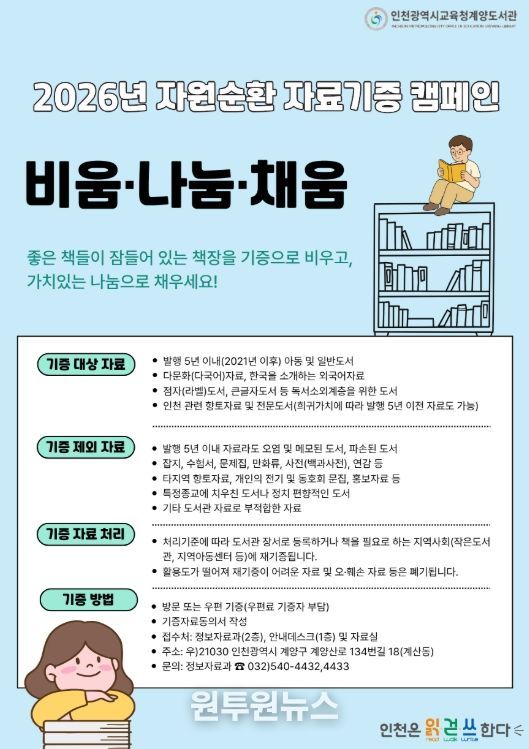 (원투원뉴스) 인천광역시교육청계양도서관은 시민과 지역사회가 함께하는 자원순환형 독서문화 확산을 위해 2026년 자료기증 캠페인 ‘비움·나눔·채움’을 연중 운영한다고 5일 밝혔다.