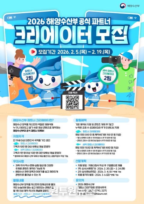 (원투원뉴스) 해양수산부는 2026년 한 해 동안 해양수산 정책을 국민 눈높이에 맞춰 쉽고 재미있게 전달해 줄 ‘2026 해양수산부 공식 영상 협력 제작자’를 2월 5일부터 2월 19일까지 모집한다고 밝혔다.